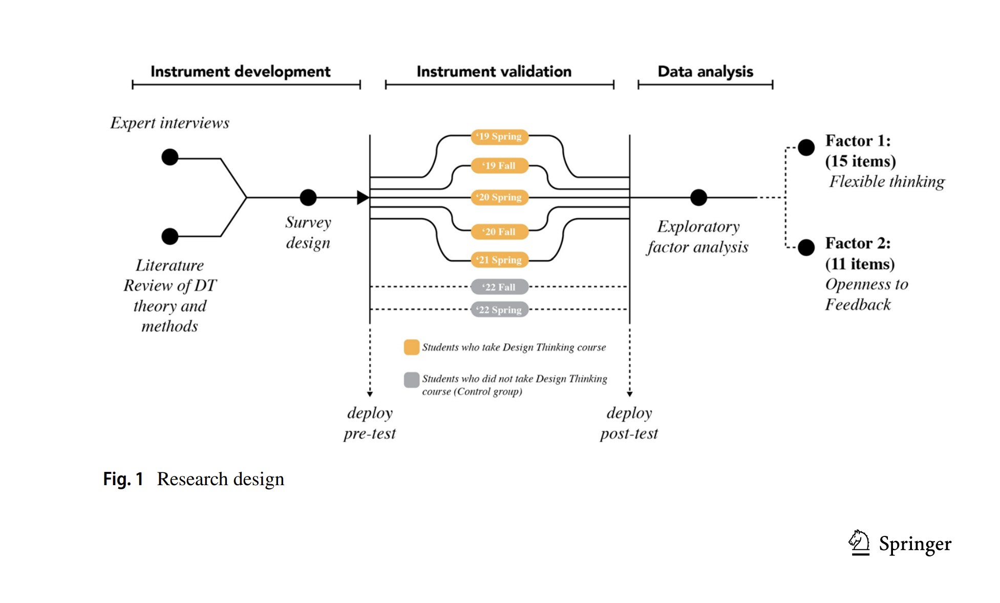 Design Thinking (DT), the collaborative and human-centered problem-solving approach to tackling complex issues, is one of the most coveted skill sets of the twenty-first century. Institutions in industry and academia are actively seeking train- ing opportunities to increase their staff’s capability to harness the intricacies of DT. However, although there have been several different methods and curric- ula aimed at increasing individuals’ abilities in utilizing DT, previous studies do not put forth a validated scale that can be used to evaluate the impact of DT training on multidisciplinary undergraduate students with no prior DT experi- ence. We address this gap by providing a validated scale to measure the impact of DT mindsets and skills and to reveal the impact of a DT course based on self-reported quantitative data from 162 participants (control: 34, experimental: 128) who completed pre- and post-assessments. Moreover, we provide the result- ing two-factor structure, Flexible Thinking and Openness to Feedback, and show a statistically significant positive impact of a DT course for undergraduate stu- dents from diverse disciplines. In our experiment, modifying the IDEO Toolkit model by incorporating’video sketching’ and a’cryptomnesia-preventing guerrilla thinking task’ allowed us to develop a more affordable and universally accessible curriculum, as well as playing a crucial role in facilitating the development pro- cess. The validated scale developed in this research holds significant potential for adoption across educational, business, and industrial contexts, where fostering creativity and innovation is critical.