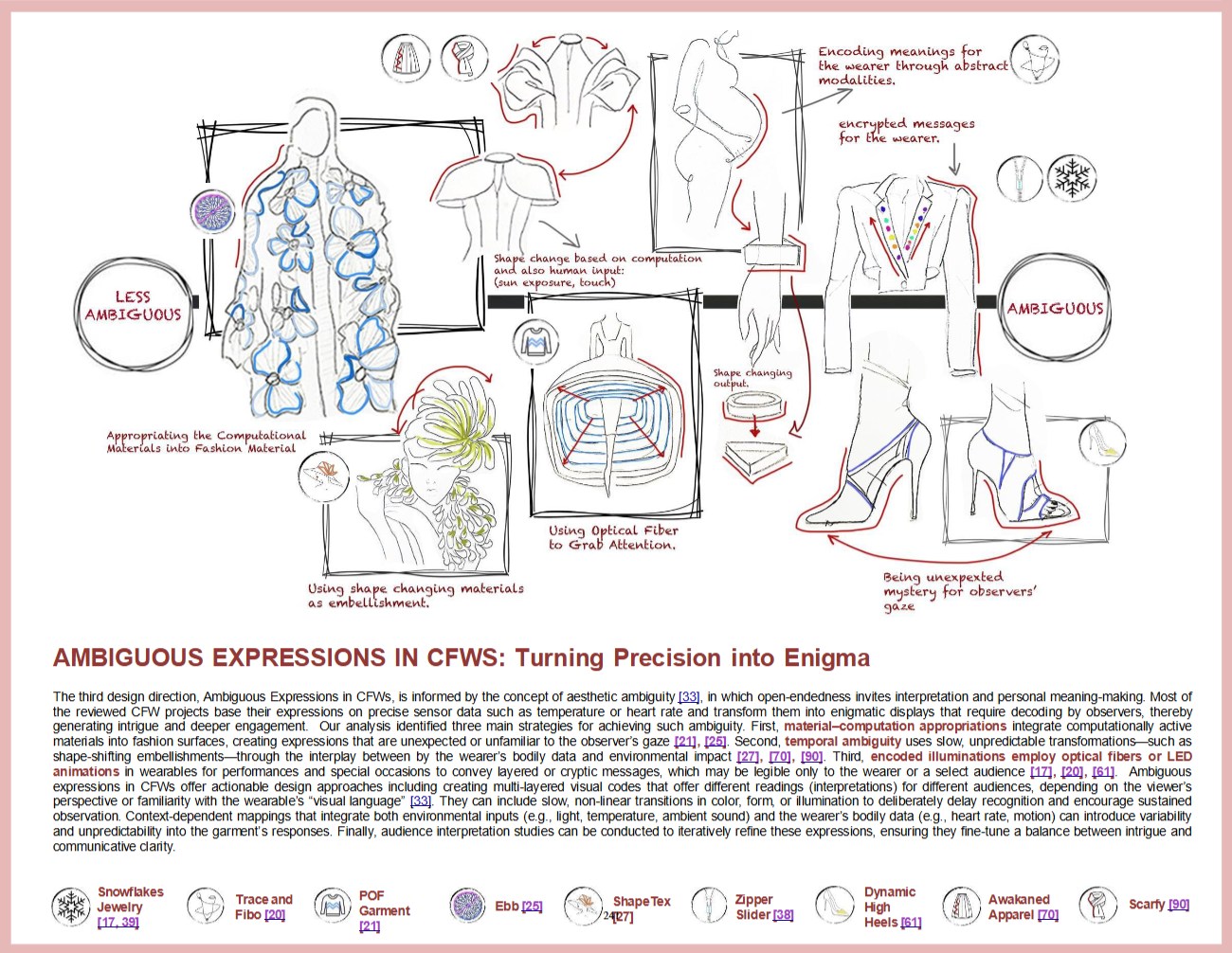 The present design challenges in computational fashion wearables (CFWs)increasingly focus on aesthetics and fashionability, as social acceptance often outweighs purely functional concerns. Since CFWs engage directly with social bodies, aesthetic considerations are becoming central in their adoption and cultural resonance. While existing literatur eextensively addresses technical aspects, aesthetic-focused research remains limited. This pictorial addresses that gap by examining CFW projects from academic contexts through a Visual Literature Review (VLR) and reflexive thematic analysis (RTA). Using freehand sketching as an analytical and generative tool, we annotated and synthesized a portfolio of prototypes, drawn from our previous literatu rereview on CFWs, identifying three design directions—Augmented Expressions, Dialogic Expressions, and Ambiguous Expressions. These directions highlight how computational and fashion elements can be integrated to enhance expression, foster interaction, and embrace interpretive ambiguity. The findings offer actionable insights for designers and researchers, positioning aesthetics as a decisive factor in shaping future CFW innovation.
